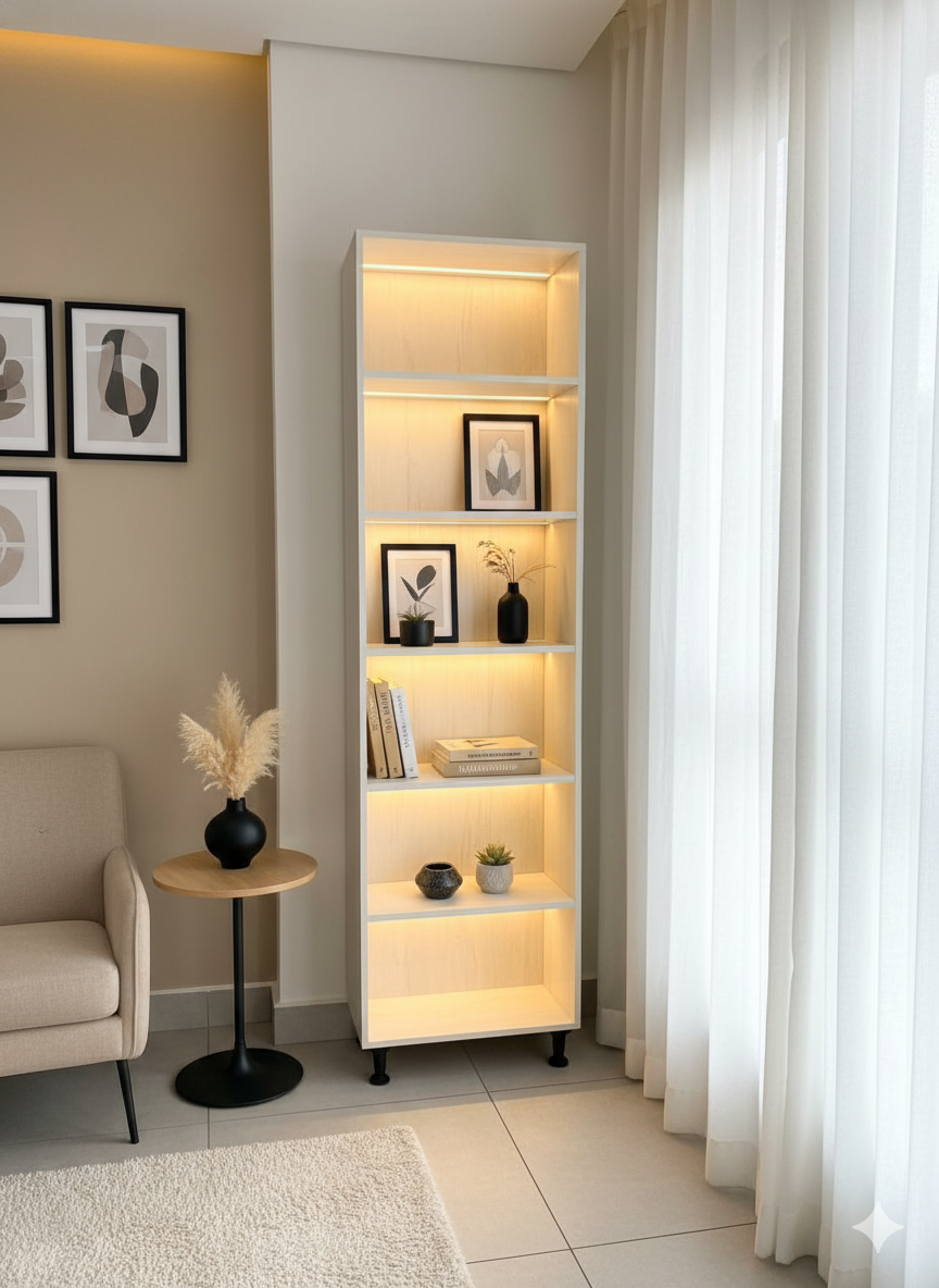 Exhibidor con luz LED para espacios modernos, fabricado con materiales de calidad y pensado para uso diario.