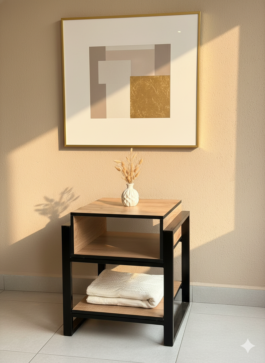Mesa de noche en RH y hierro 2 para espacios modernos, fabricado con materiales de calidad y pensado para uso diario.